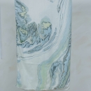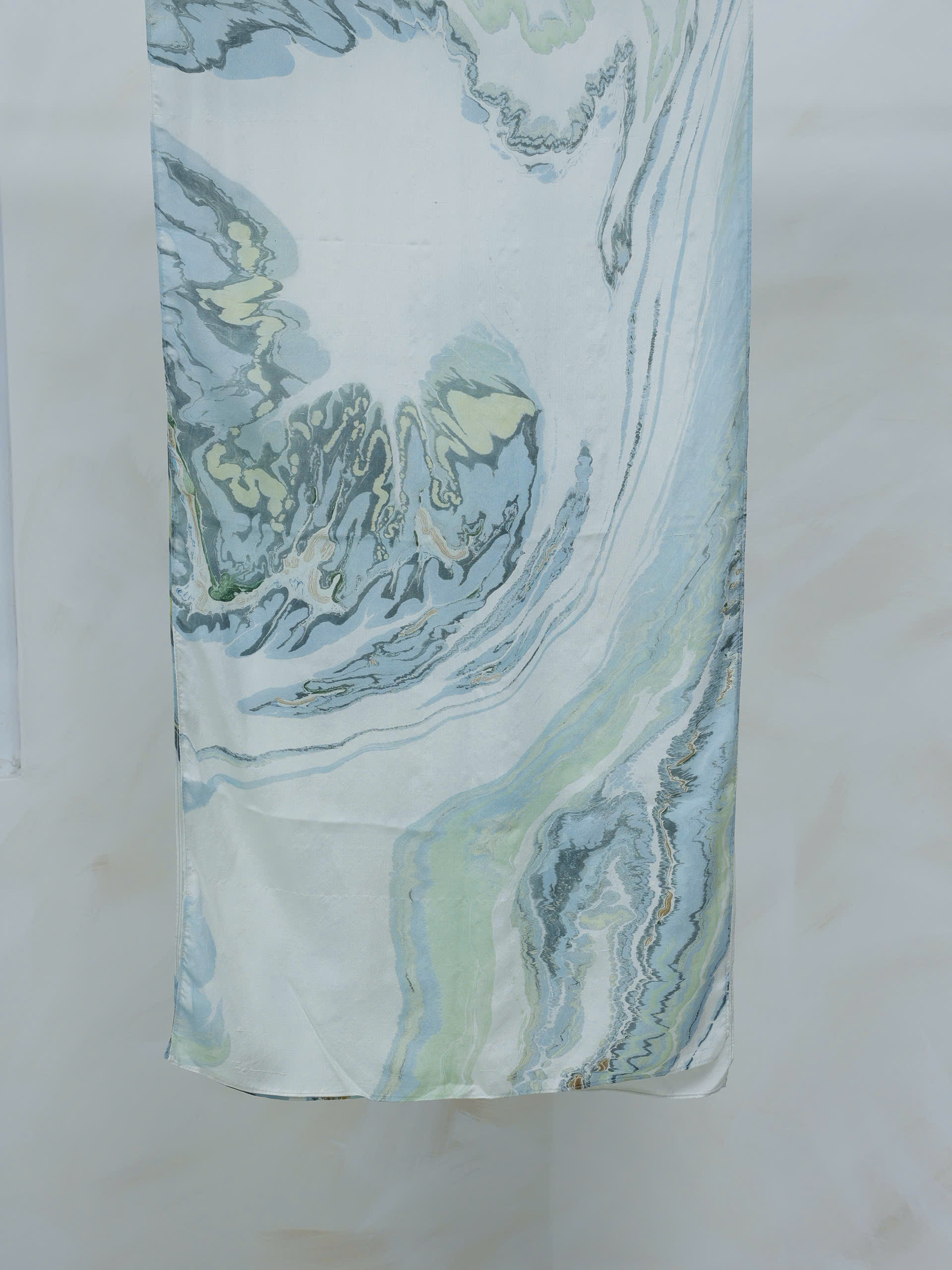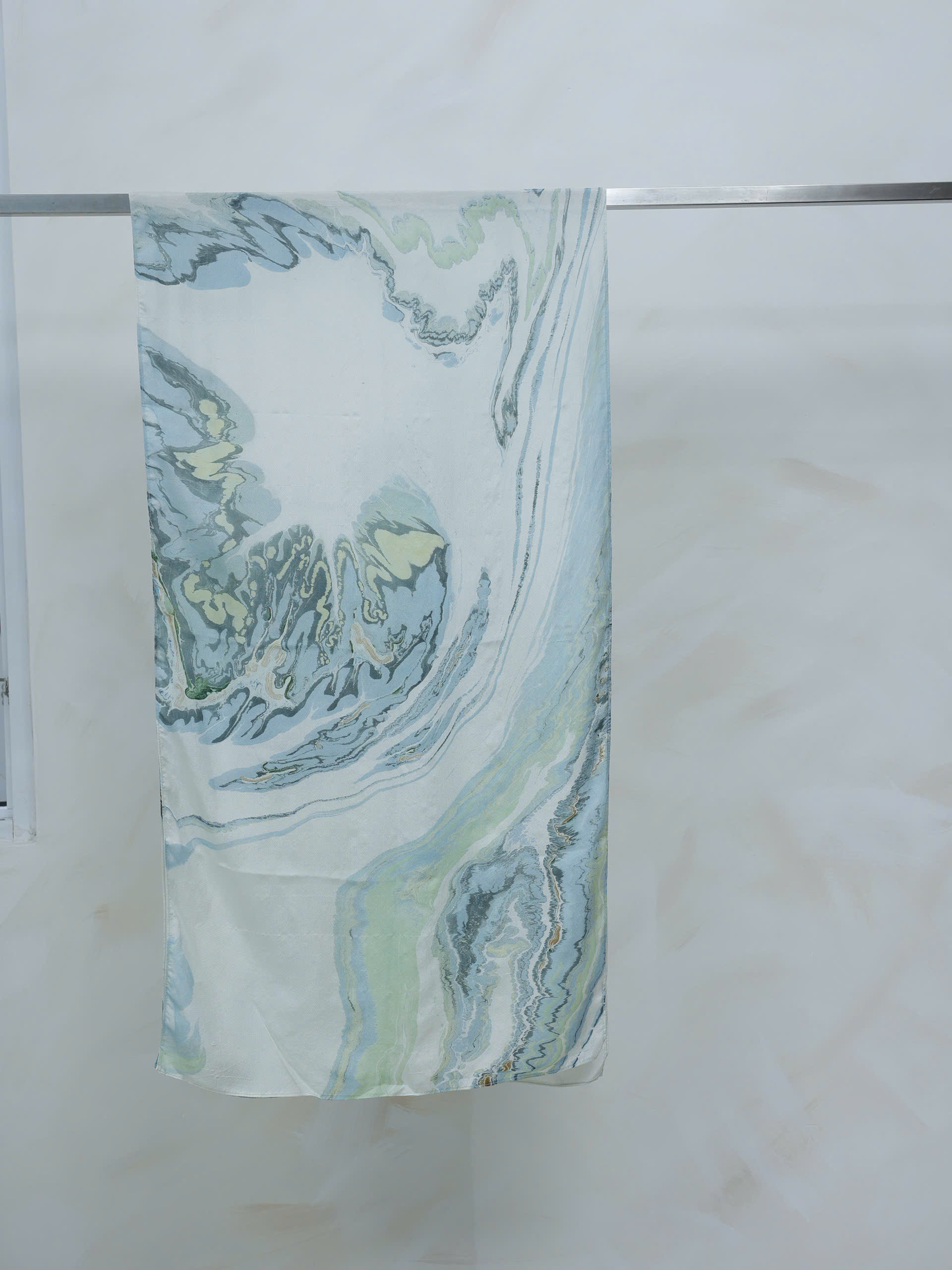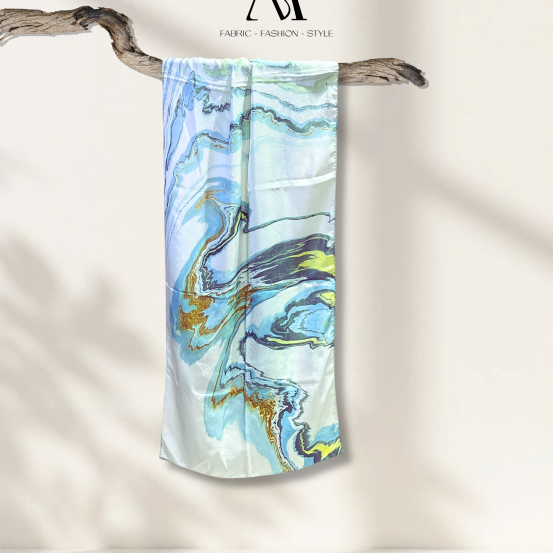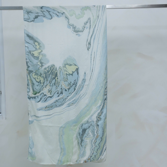 Khăn được in bằng kỹ thuật thuỷ ấn, tạo nên những vân nước mềm mại, uyển chuyển như dòng chảy tự nhiên. Trên nền lụa mịn nhẹ, từng hoạ tiết hiện lên ngẫu hứng nhưng hài hoà, không lặp lại.