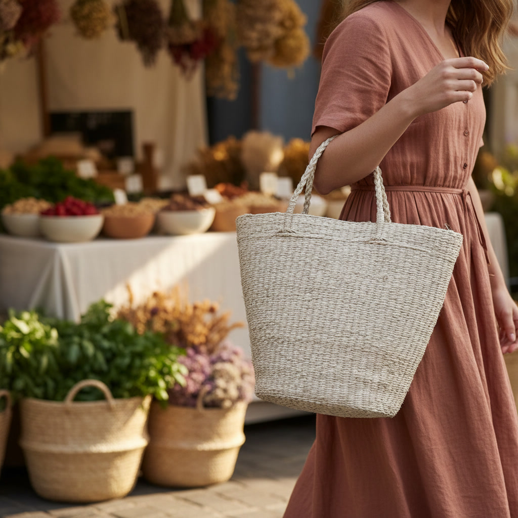 Túi xách được đan hoàn toàn thủ công từ sợi tơ thô – loại sợi giữ trọn vẻ mộc mạc, tự nhiên và có độ bóng nhẹ đặc trưng của tơ tằm. Kết cấu sợi tơ thô mang đến bề mặt vải hơi sần, giàu chiều sâu và cảm giác chạm rất chân thật. Từng mắt đan được thực hiện bởi nghệ nhân lành nghề, tạo nên chiếc túi chắc chắn, bền bỉ nhưng vẫn nhẹ nhàng và tinh tế.